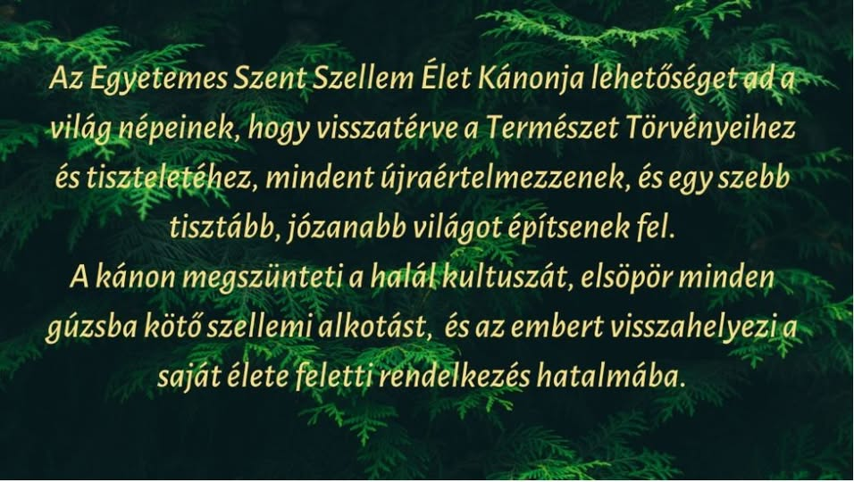 Az Egyetemes Szent Szellem Élet Kánonja , 2020. május 31-én kihirdetésre került, mely esemény az Új Világ kezdete is egyben. Így idén június 1-én a 6. évébe lépett a „TÖRVÉNYEK TÖRVÉNYE” mely kihirdetése napjától mindenre és mindenkire kötelező jelleggel vonatkozik.